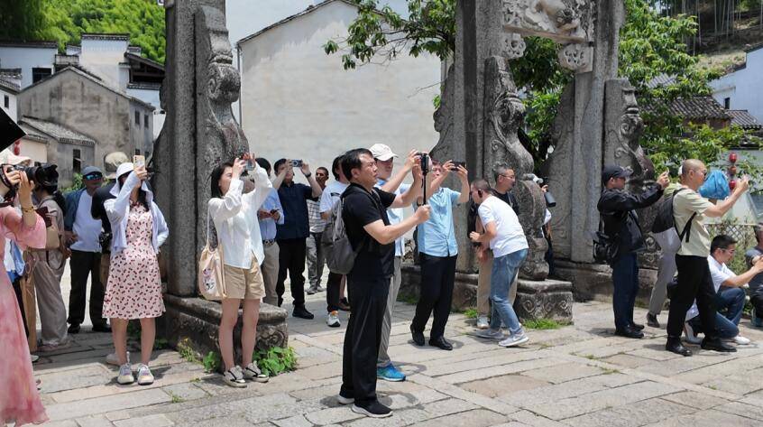 网络名人在灵山村打卡拍照。 下午,采风团转至西溪南村,成员们继续捕捉原生态湿地景观,古树、溪流与石桥在光影交错间勾勒出一幅动人的自然画卷,随后探访了以自然生态与创意体验为核心的消费的新场景,让更多人直观感受到徽州乡村在现代化进程中的创新实践。