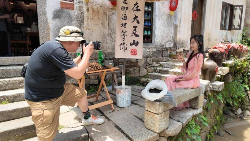 网络名人拍摄西溪南绿野仙踪。 采风团上午抵达灵山村,成员们沿着青石板路穿行,用镜头记录下粉墙黛瓦的古民居、蜿蜒曲折的街巷等,沉浸式感受“灵山之舞”等文旅业态,将徽州的历史文化传递给更多人。